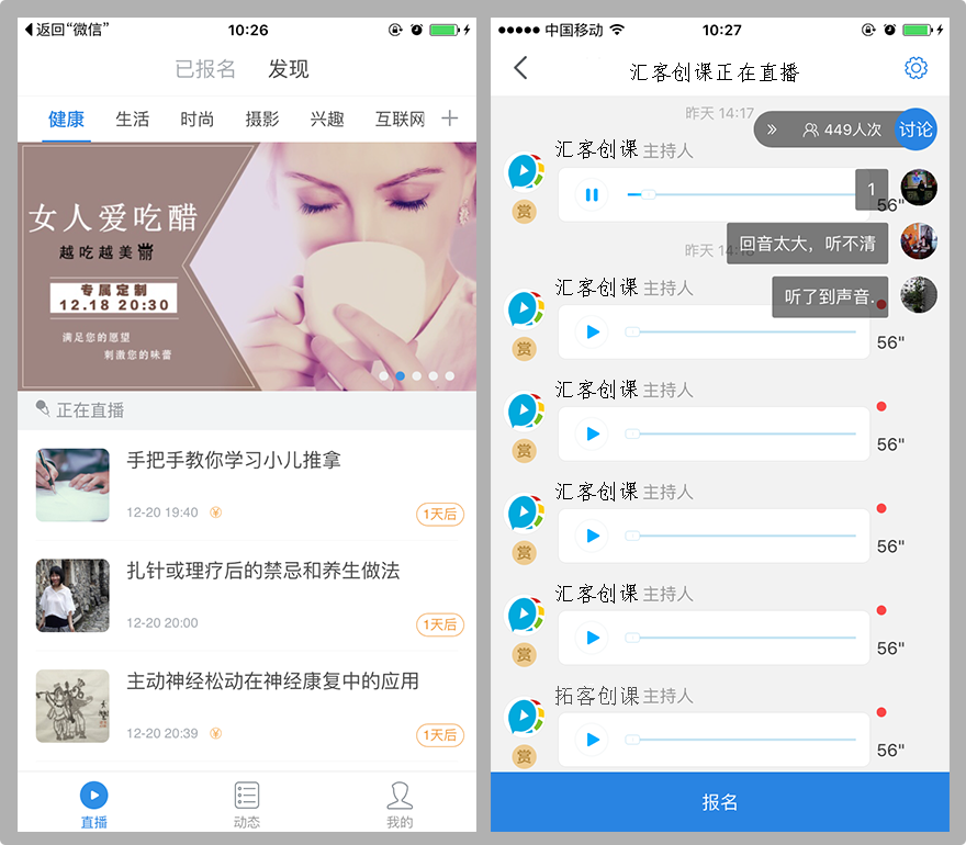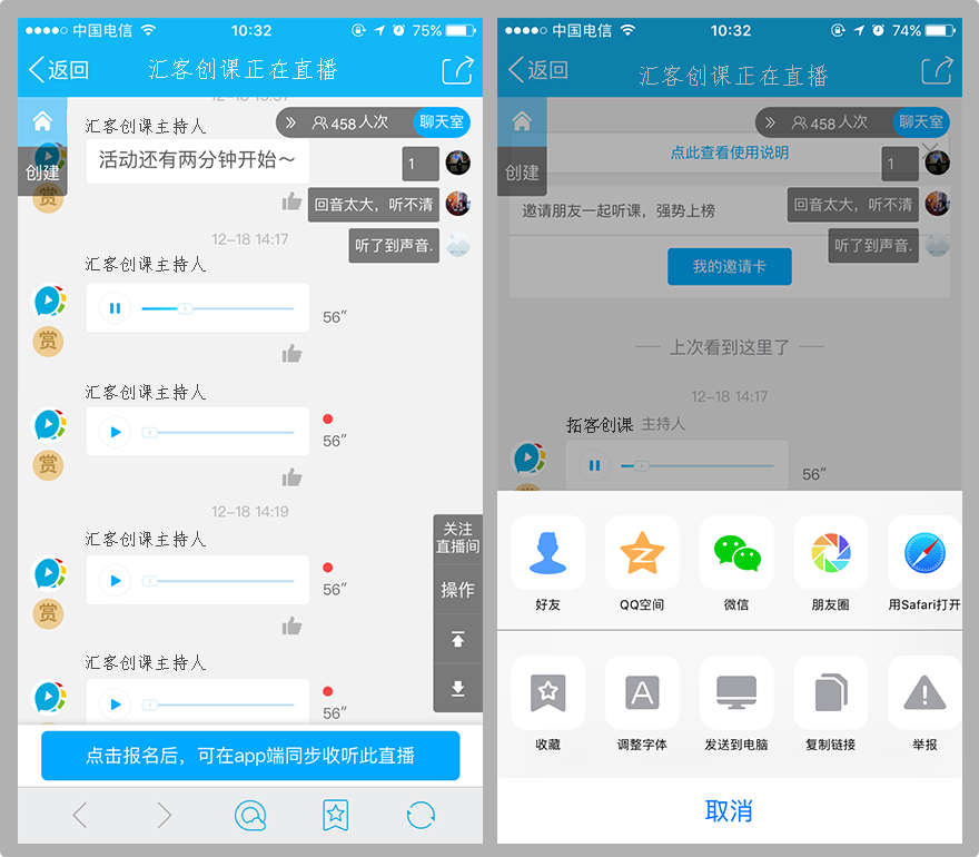 基础的直播模式,支持一键转发朋友圈和微信群,听众点击简单一个链接就能收听直播,快速铺开你的影响力!
