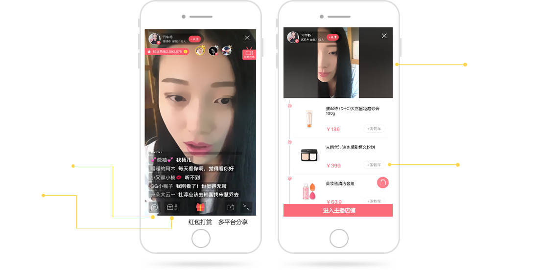平台与美女主播共享用户打赏的礼物、道具分成,红人主播的平台增值收益数以千万计。